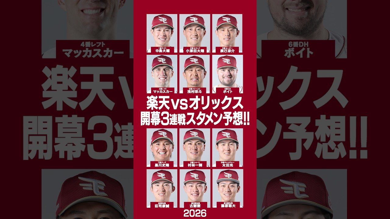 🦅2026楽天『開幕スタメン』予想🦅 #東北楽天ゴールデンイーグルス #オリックスバファローズ #開幕 #プロ野球 2026年楽天イーグルスの開幕は敵地京セラドームでオリックスと対戦💥開幕初戦の先発は荘司 康誠‼️注目のショート宗山塁は打撲の影響で欠場濃厚に・・・😭 #野球 #baseball #rakuten #宗山塁 #辰己涼介 #浅村栄斗 #京セラドーム大阪 #田中将大 OhtaniOtanishoheiTohoku Rakuten Golden Eaglesドジャースボイトマッカスカー大谷翔平太田 光村林 一輝東北楽天ゴールデンイーグルス黒川 史陽 NPBHUB.COM | The Fanbase of Nippon Baseball & Nippon Professional Baseball