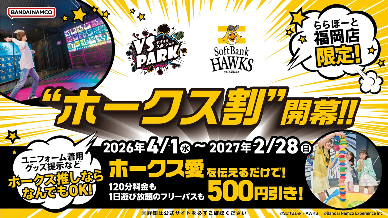 株式会社バンダイナムコエクスペリエンスが企画・プロデュースする屋内“ヤバすぎ”アクティビティ施設『VS PARK WITH G ららぽーと福岡店』で、2026年4月1日(水)から2027年2月28日(日)の期間で、ホークスファンなら割引価格で遊べる「ホークス割」キャンペーンを開催します。