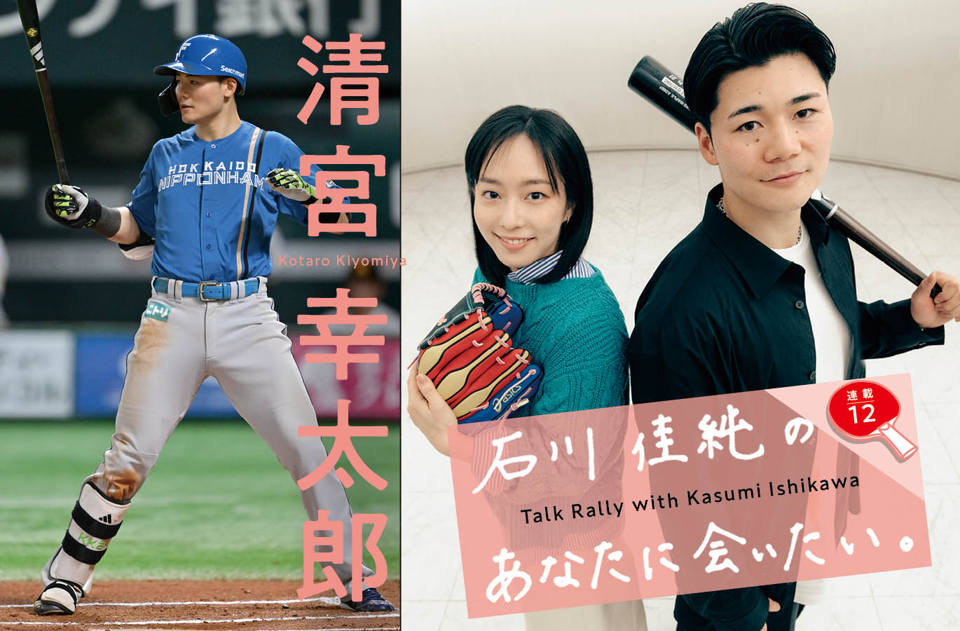第12回のゲストは、北海道日本ハムファイターズの清宮幸太郎選手です。昨シーズンはキャリアハイとなる138試合出場、リーグ2位となる143安打を記録。さらに年俸も大台1億円を突破しました。そんな清宮選手に石川さんが今シーズンの意気込みをはじめ、ラグビーとの‟二刀流”だった小学生時代や卓球と野球の意外な共通点、北海道での‟料理男子”な自炊事情までたくさんの質問を投げかけ、清宮選手は一つひとつ丁寧かつユーモアたっぷりに打ち返しています。