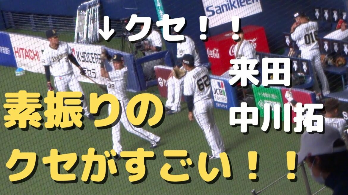 素振りをする来田選手が数回「クセがすごい」素振りをしていました。