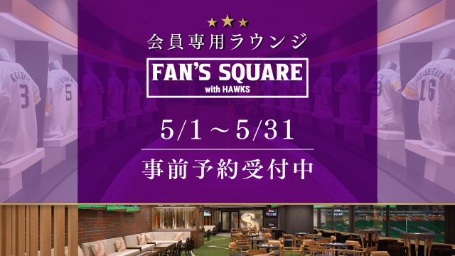タカポイントでは、5月1日(金)~5月31日(日)にみずほPayPayドームで開催する公式戦における会員専用ラウンジ「FAN’S SQUARE」事前予約の抽選受付を開始します。当日の観戦チケットをお持ちのダイヤモンド・プラチナステージ会員様のみお申し込み可能です。