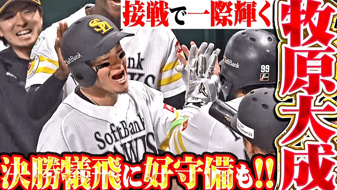 福岡ソフトバンク・牧原大成が攻守でチームを救う!! 同点で迎えた6回には、2死2塁から初球を捉えた勝ち越しタイムリー!! 再び同点とされ迎えた8回にはダイビングキャッチで先頭打者をアウトにし、相手の反撃の芽を摘む好プレー!! その直後、1死1,3塁チャンスで犠牲フライを放ち勝ち越し!! 2度の勝ち越し打に好プレー…接戦で一際輝く活躍で存在感を発揮しました!!