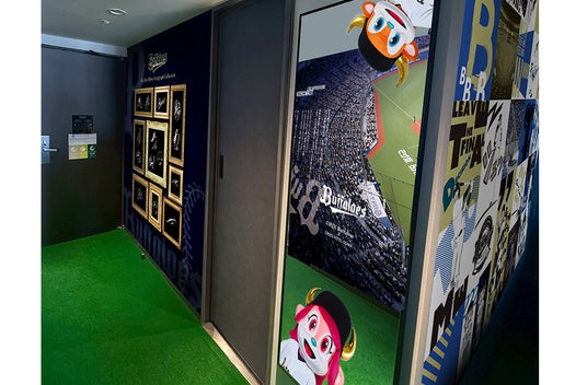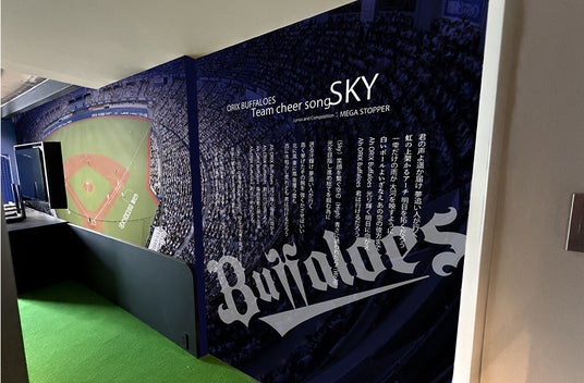 客室の扉はオリックス・バファローズの新しいロゴと、球団カラーのゴールドとネイビーをバランスよく配したデザインが施され、入室前からわくわくする空間へ誘います。入室すると足元からグラウンド感を感じる人口芝を敷き詰めた床が広がり、右側にはラッキーセブンを盛り上げる球団応援歌「SKY」の歌詞が組み込まれた京セラドーム大阪のパノラマウォールシートを配置。左側には選手のサインがデザインされたウォールシートがお出迎えします。奥に配した躍動感あふれる選手画像を使用したストリートアート調のウォールデザインで選手の熱気を感じつつ、マスの1つを撮影しても良し、背景として撮影しても楽しめるコンテンツです。また「選手のロッカールームをイメージしたクローゼット」や「選手が座るベンチを模した椅子」は昨年に引き続き設置し、選手気分を味わえる設えはそのままに「オリックス・バファローズ」をたっぷり全身で感じる客室でホテルステイを楽しめます。