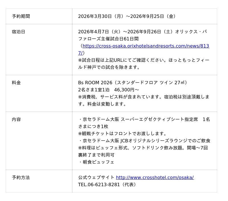 クロスホテル大阪(所在地:大阪市中央区、総支配人:水谷 之則)は、オリックス・バファローズコラボルーム「Bs ROOM 2026」を2026年3月30日(月)より実施します。また、本拠地京セラドーム大阪スーパーエグゼクティブシートでの観戦チケットがセットになった宿泊プランを、本日よりホテル公式ウェブサイト(https://www.crosshotel.com/osaka/)にて販売を開始します。