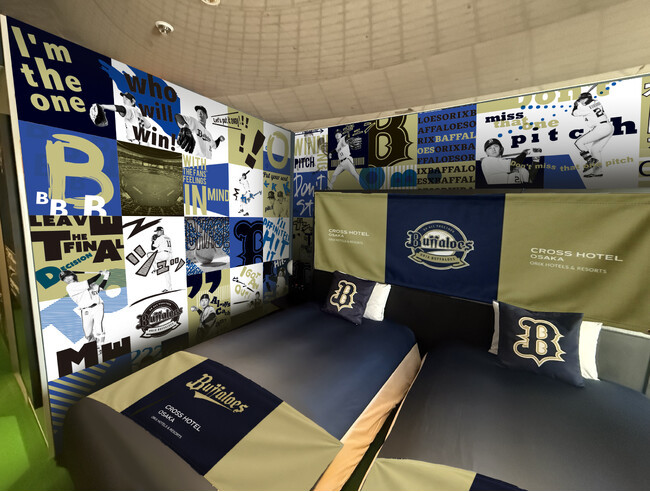 オリックス・バファローズコラボルーム「Bs ROOM」は2022年からスタートし、5年目を迎えました。客室全体でオリックス・バファローズを感じていただけるコラボルームです。昨年、クロスホテル大阪Instagram公式アカウントで理想の客室アイデアを募集するキャンペーン時にいただいたアイデアから「人工芝を敷き詰めた床」はそのままに、観客席からグラウンドを見ているような京セラドーム大阪のパノラマシートでまるで球場にいるような没入感を体験。また、躍動感あふれる選手画像を使用したストリートアート調のデザインが色々な角度からの異なるバファローズを表現しています。オリックス・バファローズファンには堪らない空間を提供します。熱い試合の余韻そのままに、クロスホテル大阪で「Bs ROOM 2026」にご宿泊いただき、推し選手に囲まれた特別なひとときをお楽しみください。