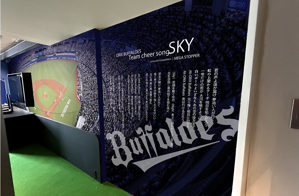 客室の扉はオリックス・バファローズの新しいロゴと、球団カラーのゴールドとネイビーをバランスよく配したデザインが施され、入室前からわくわくする空間へ誘います。入室すると足元からグラウンド感を感じる人口芝を敷き詰めた床が広がり、右側にはラッキーセブンを盛り上げる球団応援歌「SKY」の歌詞が組み込まれた京セラドーム大阪のパノラマウォールシートを配置。左側には選手のサインがデザインされたウォールシートがお出迎えします。奥に配した躍動感あふれる選手画像を使用したストリートアート調のウォールデザインで選手の熱気を感じつつ、マスの1つを撮影しても良し、背景として撮影しても楽しめるコンテンツです。また「選手のロッカールームをイメージしたクローゼット」や「選手が座るベンチを模した椅子」は昨年に引き続き設置し、選手気分を味わえる設えはそのままに「オリックス・バファローズ」をたっぷり全身で感じる客室でホテルステイを楽しめます。