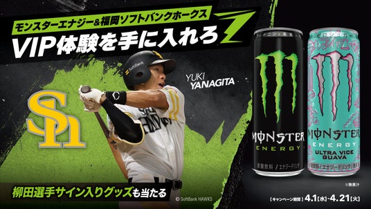 「モンスターエナジーDAY」の開催を記念し、4月1日(水)~4月21日(火)の期間、ダイレックス各店舗にて、「モンスターエナジー&福岡ソフトバンクホークス VIP体験を手に入れろ」キャンペーンを開催いたします。モンスター商品の購入本数によって応募できる景品を複数ご用意しています。
