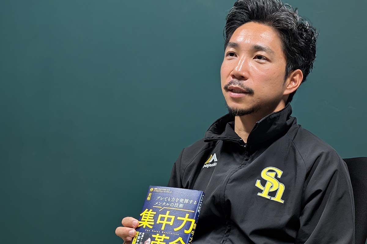 伴さん 「ホークスの選手たちもそうだったんですけど、メンタル弱いですとか強いですとか、生まれ持った性格のように言う選手も多くいたんです。でも、『僕、そういう性格なんで』みたいになってしまうと、もうおしまいというか、トレーニングのやりようがないですよね。そうじゃなくて、メンタルって力を発揮できる能力のことで、後天的に磨くことのできるスキルなんだ、具体的には集中力なんだと。打席に立った時に、打てるか打てないかという結果に注意を向けて集中していくのか、相手のピッチャーのリリースのタイミングに合わせて始動することに集中していくのかでは、全然反応の仕方が変わってくるんです。今この瞬間の自分のプレーの内容、具体的な行動に集中を向けること、これはスキルなんだ、技術なんだということをずっと選手たちに最初から伝えています。選手一人一人と、何に集中していくと良いパフォーマンスが出せるのかを見極めて、それをどんな時でもやれるような技術をトレーニングしていこうと。その一つのやり方として、会話を通じてセットして、実行して、振り返りをして、というサイクルを一人一人と回し続けています」