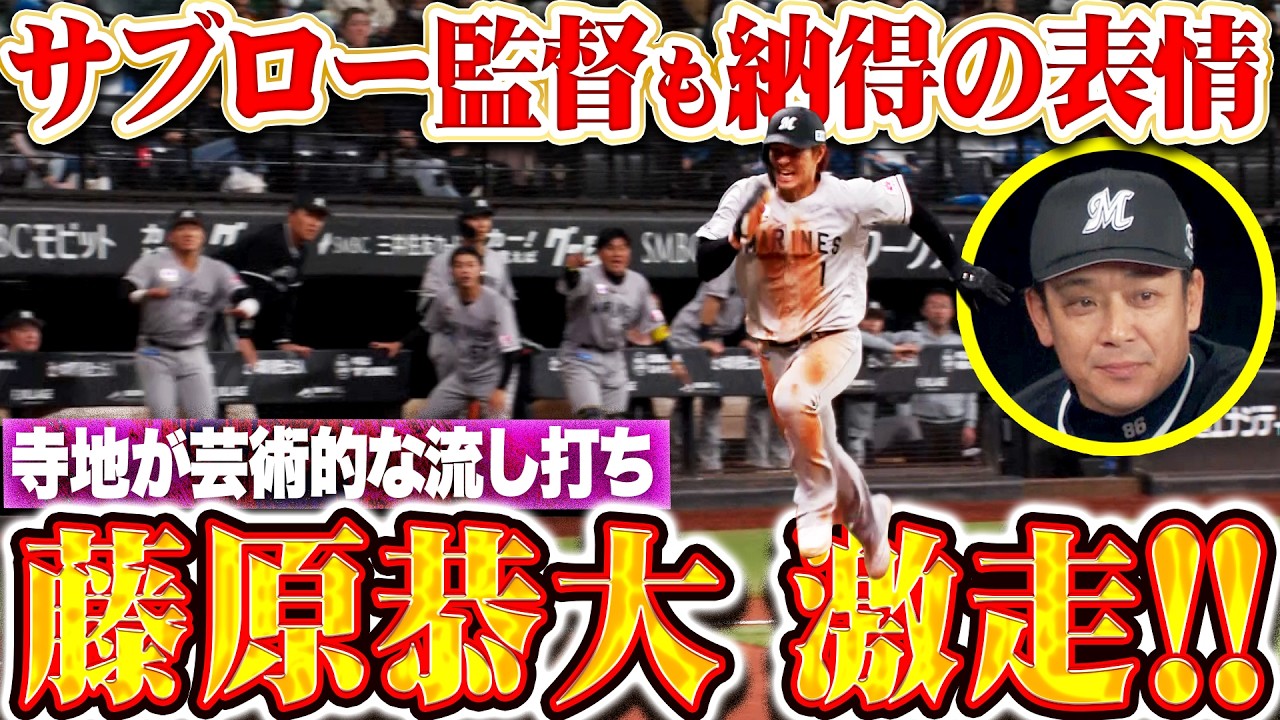 6回表、千葉ロッテの寺地隆成が技ありの一打を放つ。139キロのスライダーを呼び込んで呼び込んで芸術的な流し打ち。20歳とは思えぬ一打に2塁走者の藤原恭大も激走で応える!! この一打に、サブロー監督もベンチで納得の表情。