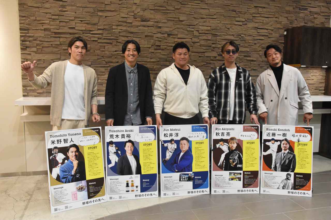 イベントには米野智人氏、近藤一樹氏、荒木貴裕氏、松井淳氏、秋吉亮氏の5名が登場。サイン・写真撮影会のほか、元選手たちが引退後に手がけた商品の販促会も行われ、会場には多くのファンが列を作った。