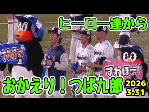 小川&オスナ&増田 ヒーロー達から「つば九郎おかえり」(東京ヤクルトスワローズ 2026/3/31) 2026.03.31 神宮球場にて。 本日のヒーロー、小川泰弘&ホセ・オスナ&増田珠選手達からつば九郎へおかえりのヒーローインタビュー。 勝利の勝鬨すわほーもみんなで。 #東京ヤクルトスワローズ #スワローズ Tokyo Yakult Swallowsオスナスワローズつばみつば九郎ヤクルト増田珠小川泰弘東京ヤクルトスワローズ NPBHUB.COM | The Fanbase of Nippon Baseball & Nippon Professional Baseball