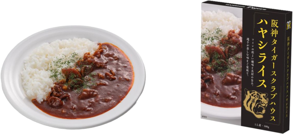 「阪神タイガースクラブハウス」は、阪神甲子園球場の1塁側外周に2007年2月に建てられた、球団事務所やロッカールーム・トレーニングルーム・サロンといった諸室が揃う阪神タイガースの施設。「阪神タイガースクラブハウス ハヤシライス」は、そのクラブハウス内の食堂で実際に提供されているハヤシライスを再現している。程よい酸味と赤ワインのコクが特徴的。