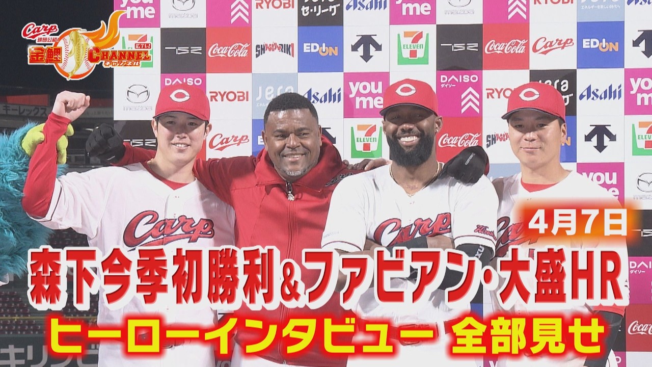 【全部見せ】森下・ファビアン・大盛がヒーローインタビュー! 2026年4月7日広島対巨人戦の ヒーローインタビューをノーカットで収録。 今季初勝利の森下、先制1号2ランのファビアン、 追加点となる1号2ランの大盛。 勝利直後の3人の声をお届けします。 広島テレビ公式YouTube【カープ公認】金鯉 チャンネル #カープ #CARP #金鯉チャンネル #広島対巨人 #ヒーローインタビュー #森下暢仁 #ファビアン #大盛穂 #今季初勝利 #ホームラン carpHiroshima Toyo Carpカープカープ公認カープ試合ゲン担ぎゴールデンルーキーマツダスタジアムルーティン令和体力強化坂倉将吾坂倉将吾捕手大盛穂広テレ広島テレビ広島東洋カープ森下暢仁森下暢仁投手金鯉金鯉チャンネル食事メニュー鯉党 NPBHUB.COM | The Fanbase of Nippon Baseball & Nippon Professional Baseball