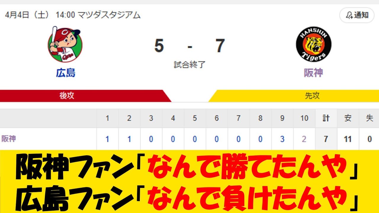 【大逆転】阪神ファン「なんで勝てたんや」広島ファン「なんで負けたんや」【野球情報】【2ch 5ch】【なんJ なんG反応】【野球スレ】