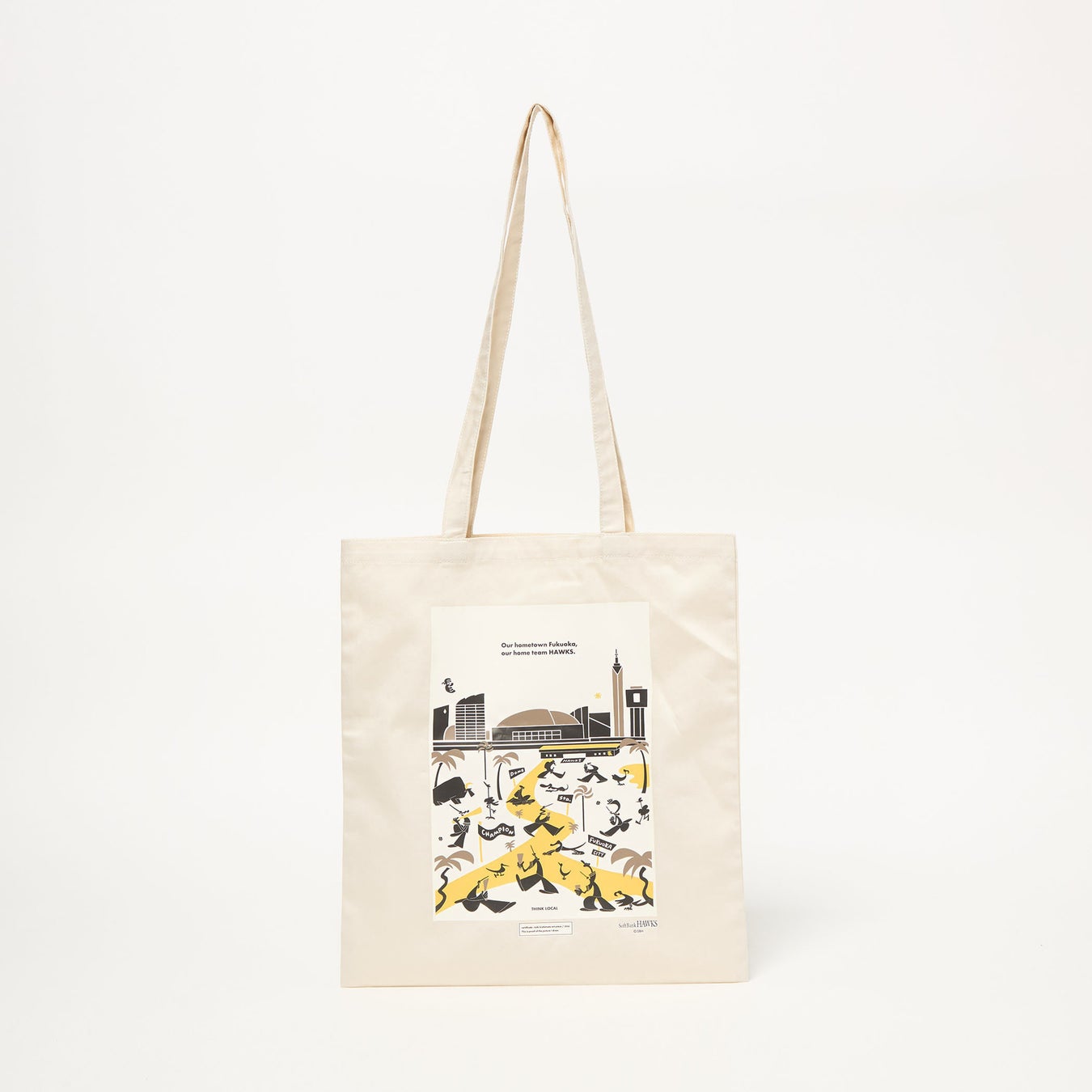 応援グッズから日用品まで幅広く収納できるA4サイズ対応トートバッグ。Tシャツとリンクしたグラフィックで、持ち歩くだけでホークスのムードが感じられます。肩掛けしやすいハンドルと軽い素材で、試合観戦にも毎日の外出にも活躍するアイテムです。