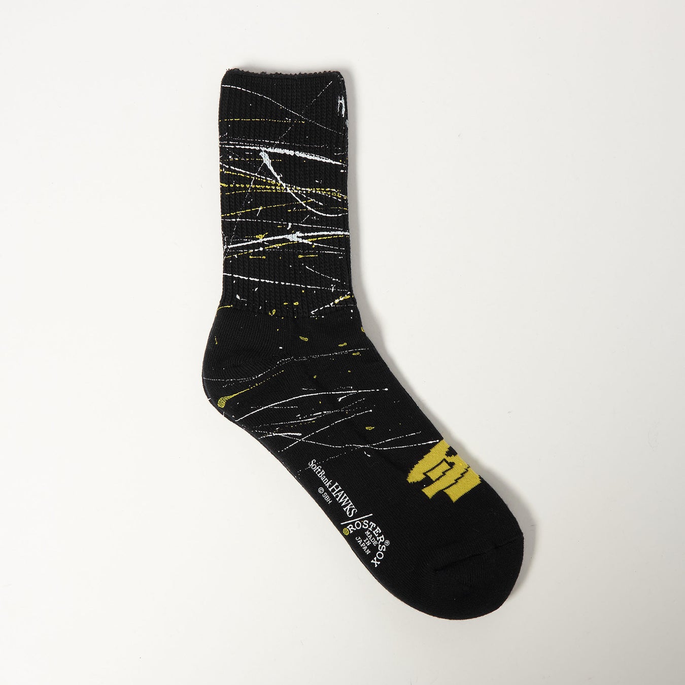 野球用語「Roster(1軍登録)」に由来するソックスブランド「ROSTER SOX」のボディをベースに、ホークスのチームカラーを想起させるペイントデザインをジャガード縫込みで表現しました。足元からホークスらしさを楽しめる一足です。