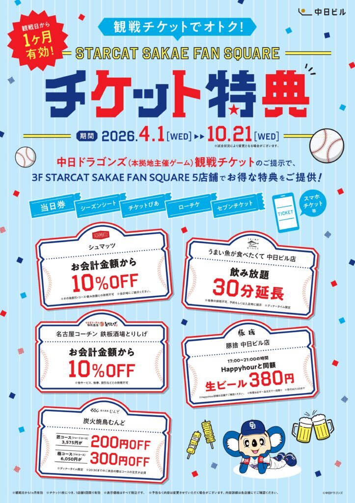 また、プロ野球シーズンの4月1日~10月21日は、中日ドラゴンズ観戦チケット(本拠地主催ゲーム/観戦日から1ヶ月以内)を提示すると様々な特典を受けられる「チケット特典」も開催中。ドラゴンズを応援した後は中日ビルでお得に楽しみましょう!