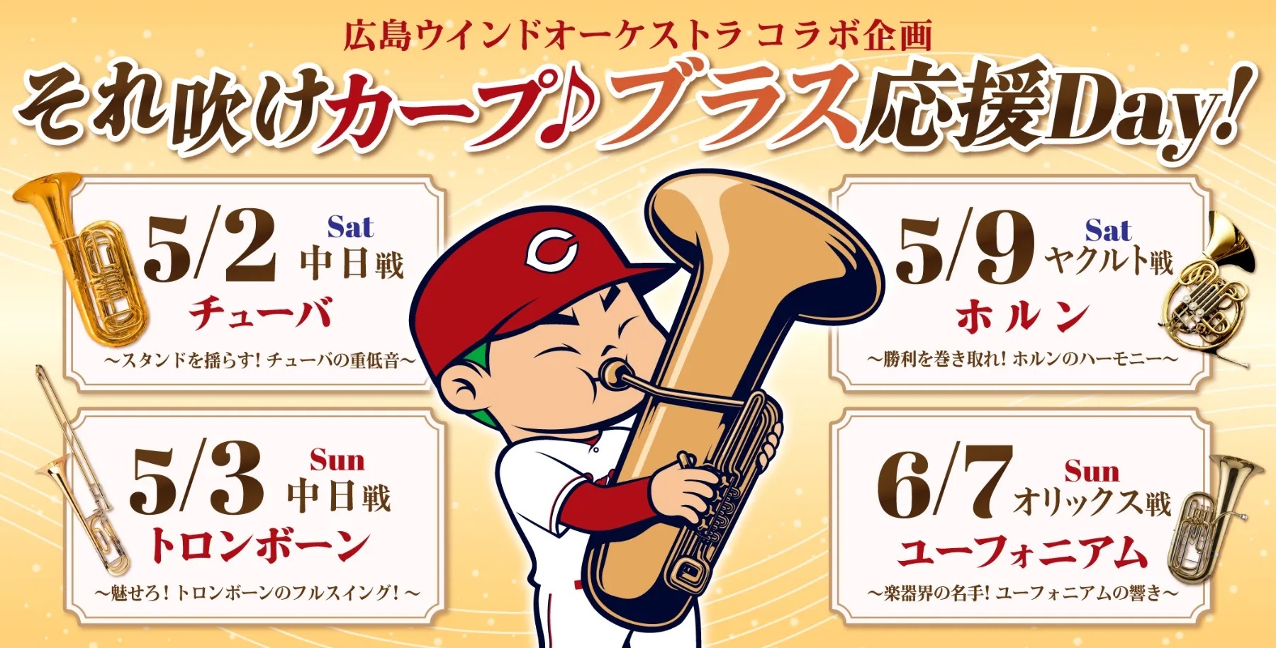 各日には、それぞれテーマがある。5月2日は「~スタンドを揺らす! チューバの重低音~」で、演奏者はチューバ10名とユーフォニアム2名。5月3日は「~魅せろ! トロンボーンのフルスイング!~」で、トロンボーン12名。5月9日は「~勝利を巻き取れ! ホルンのハーモニー~」で、ホルン12名と球団新入社員1名。6月7日は「~楽器界の名手! ユーフォニアムの響き~」で、ユーフォニアム10名とチューバ2名。各日とも迫力のある生演奏で球場を盛り上げる。