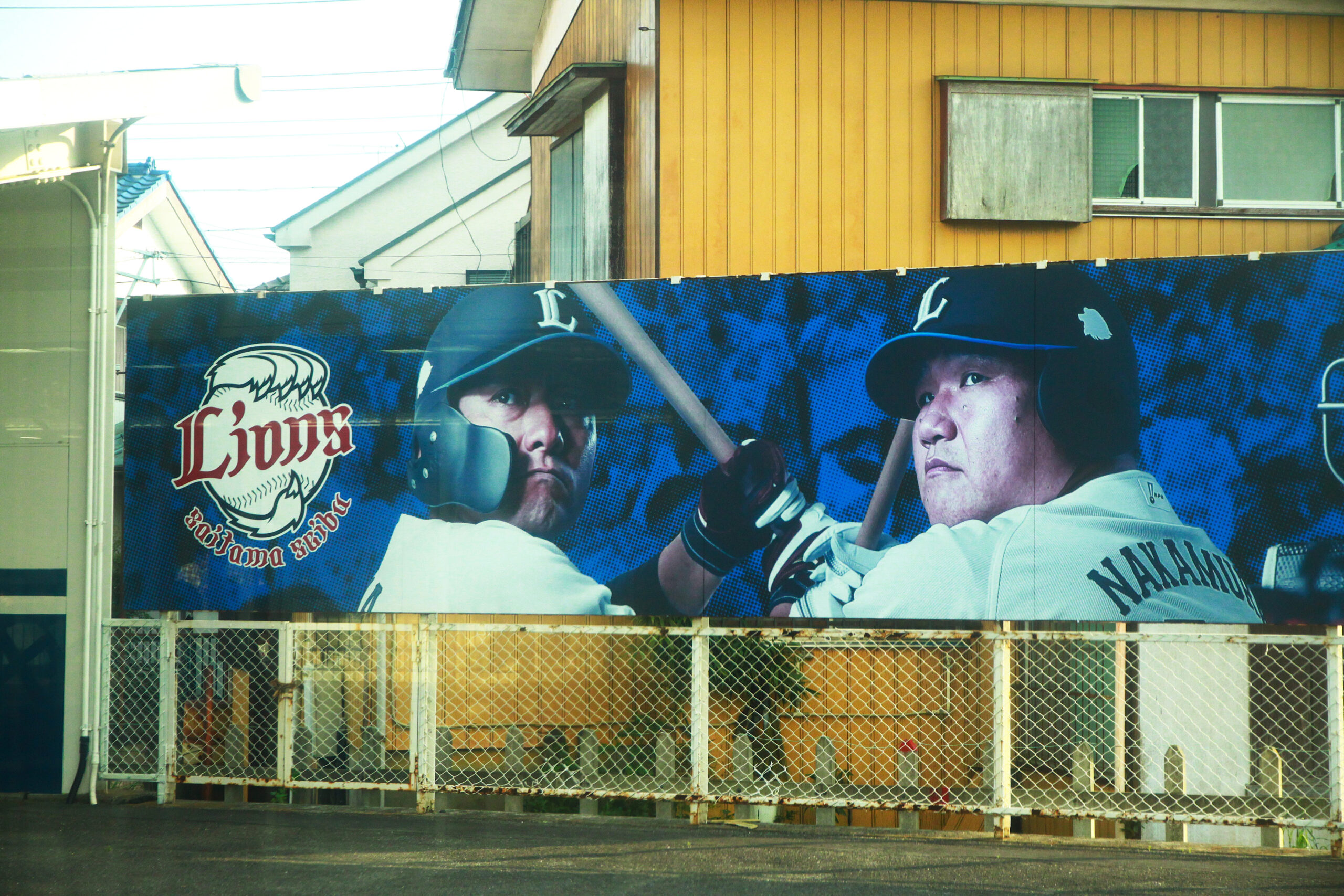 ▲西所沢駅構内の看板。左:栗山選手、右:中村選手。車内アナウンスを担当している2人が並んでいます!