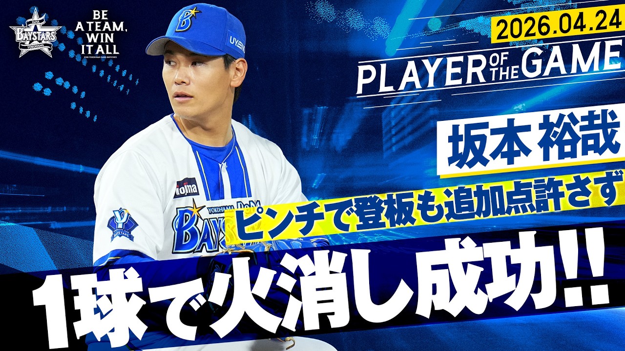 【ノーカット】坂本裕哉『ピンチの場面で登板も…たった1球で火消しに成功!!』|2026.4.24の注目シーン 1点を追う展開で迎えた7回。ここまで好投を続けていた平良拳太郎が2死から2者連続四球を許し、ピンチを背負う。ここでマウンドを託されたのは坂本裕哉。その初球、渾身のカットボールを投じると、打球はセカンドへ!! わずか1球でセカンドゴロに抑え火消しに成功!! 勝利を呼び込むパーフェクトリリーフとなりました!! #坂本裕哉 #1球火消し #ピンチ脱出 #ベイスターズ #プロ野球baystarsCENTRAL LEAGUEDeNAOfficial ChannelOfficial VideoYOKOHAMA DeNA BAYSTARSYOKOHAMA DeNA BAYSTARS Official ChannelYOKOHAMA DeNA BAYSTARS Official Videoベイスターズ横浜横浜DeNAベイスターズ横浜スタジアム NPBHUB.COM | The Fanbase of Nippon Baseball & Nippon Professional Baseball