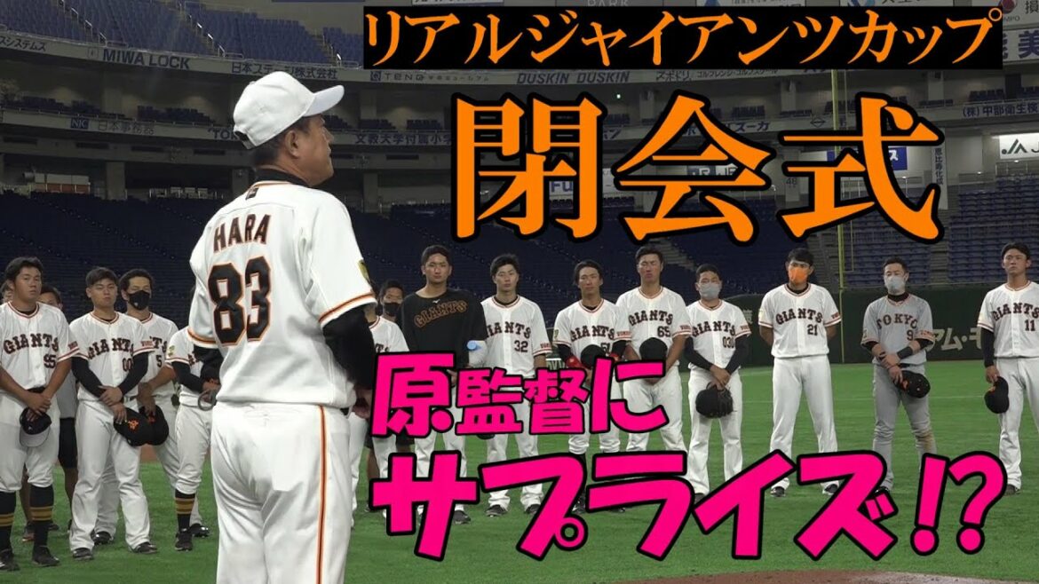 全軍混合、3チームによる対抗戦「リアルジャイアンツカップ」が閉幕しました。閉会式で原辰徳監督が挨拶を終えると選手たちからサプライズが!優勝は二岡軍、2位は元木軍、3位は阿部軍でした。試合後に二岡智宏監督、元木大介監督、阿部慎之助監督が試合を総括しました。