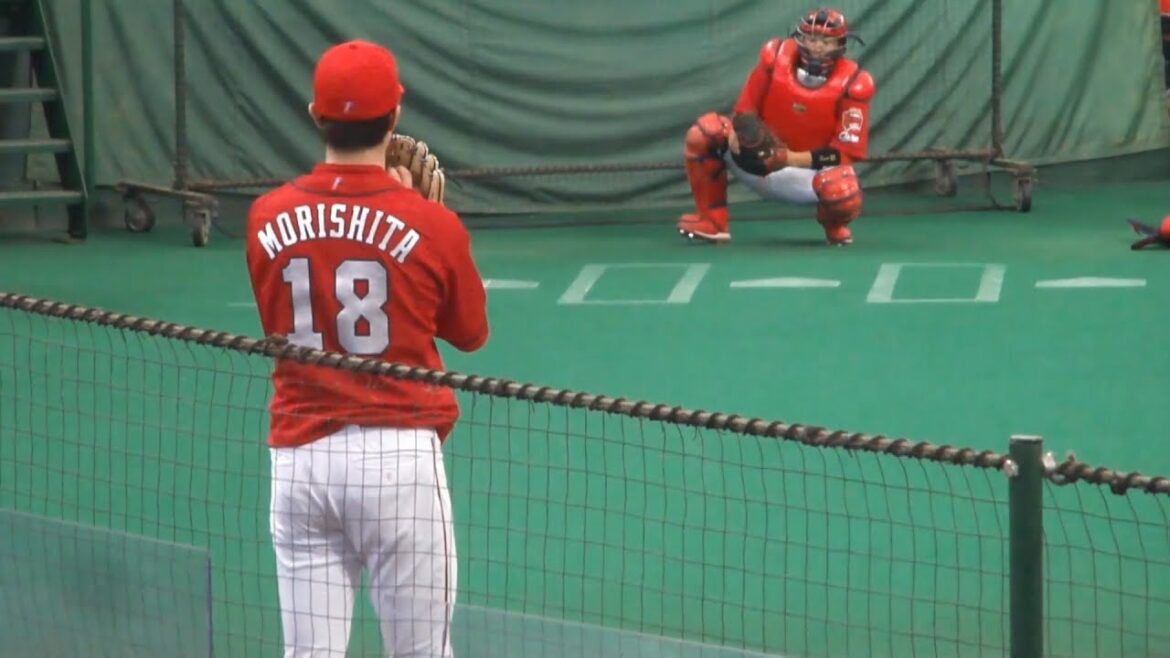 広島東洋カープ 森下暢仁が試合開始前にグラウンドでの遠投や、ブルペンで投球練習をしている映像。2022年6月11日(土) ベルーナドーム、西武 vs 広島。