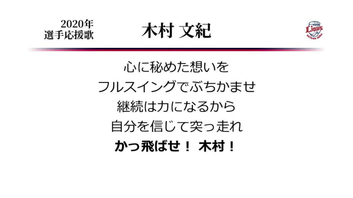西武木村選手の応援歌です。 途中で登録名を変えており、意図的なものということで仕方ないのでしょうが、 文紀で「ふみかず」と読ませるのは引っ掛かり度がかなり高い。 Fumikazu Kimura (Baseball Player)Saitama Seibu LionsSaitama Seibu Lions (Baseball Team)なんぶふじ埼玉西武ライオンズ応援歌木村文紀 NPBHUB.COM | The Fanbase of Nippon Baseball & Nippon Professional Baseball