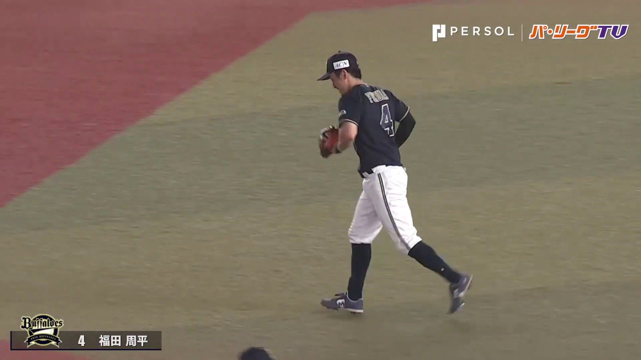 オリックス・安達了一の決勝ホームランがうれしかったのでしょう。あまにお目にかかれませんが、福田周平がアレを取り忘れて守備についてしまったようです。