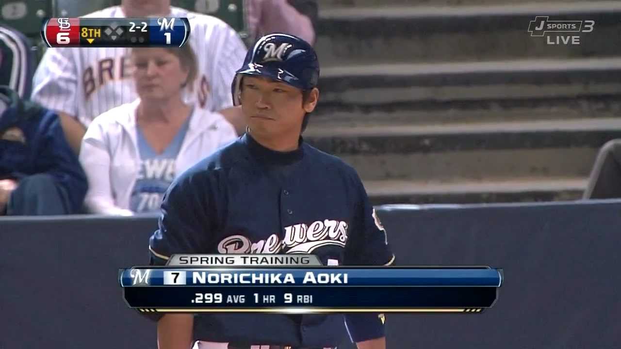 2012.4.8 本拠地ミラー・パークでの対カージナルス3回戦 8回裏に代打で登場しカージナルスのボッグスからレフト前ヒット 直後に次打者の2塁打で1塁から生還 Tokyo Yakult Swallowsミルウォーキー・ブリュワーズ東京ヤクルトスワローズ青木宣親 NPBHUB.COM | The Fanbase of Nippon Baseball & Nippon Professional Baseball