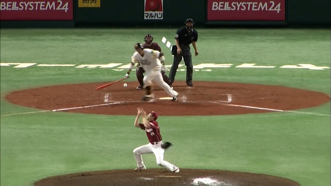 9回、李大浩のピッチャー返しの打球が福山博之のグラブへ。しかし痛烈な勢いのせいかそのままグラブには収まらず、打球は跳ねるような形で福山の頭上へと上がり、最後は素手でキャッチ。福山が機敏な反応で、誰もできないようなキャッチを披露した。(2015年4月22日 福岡ソフトバンクホークス対楽天イーグルス)