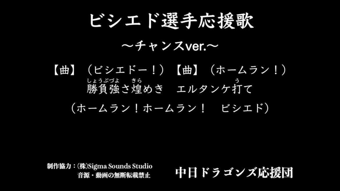 【歌詞】 【曲】(ビシエドー!) 【曲】(ホームラン!) 勝負強さ煌めき エルタンケ打て (ホームラン!ホームラン! ビシエド) <新規団員絶賛募集中!> 中日ドラゴンズ応援団 公式サイト https://chunichiouendan.wixsite.com/dragonsouendan ※動画、画像、音源等を、権利者の許可無く複製、転用、販売などの二次利用することを固く禁じます。 【制作協力】(株) Sigma Sounds Studio 【監修】中日ドラゴンズ応援団 Chunichi Dragonsビシエド 野球中日ドラゴンズ NPBHUB.COM | The Fanbase of Nippon Baseball & Nippon Professional Baseball