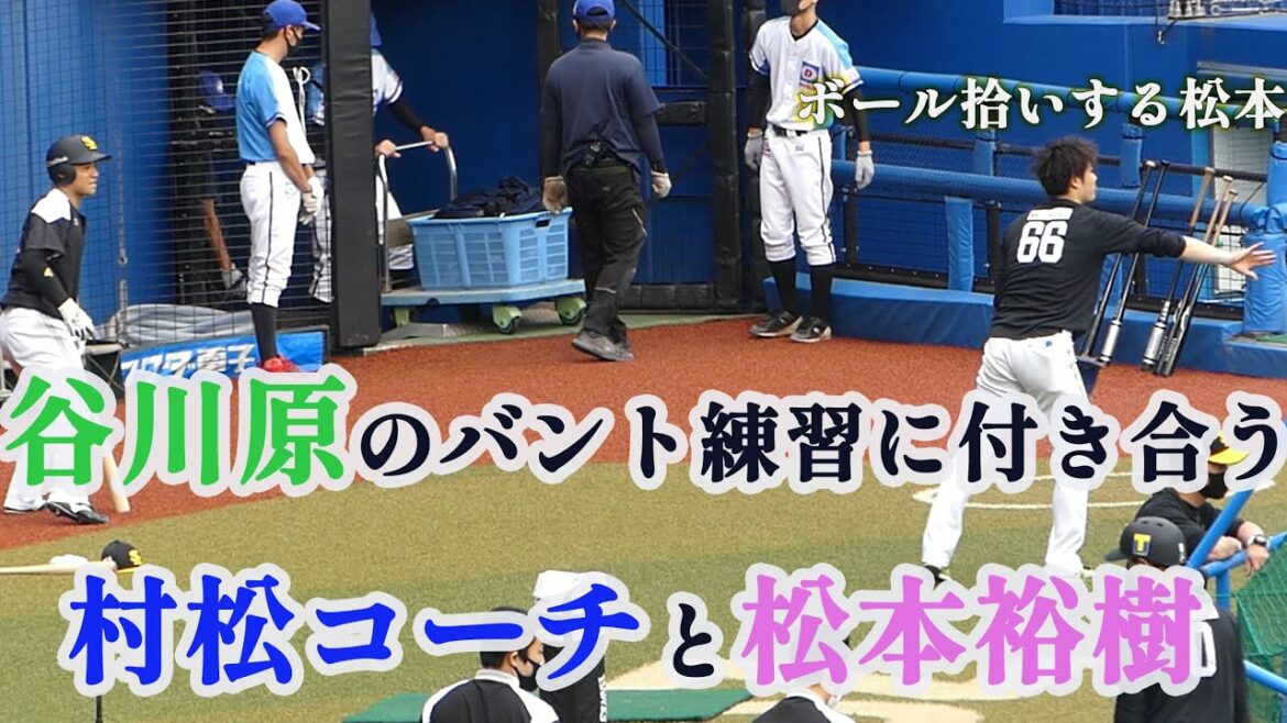 【ソフトバンクホークス】谷川原のバント練習に付き合う村松コーチと、ボール拾いする松本裕樹 福岡ソフトバンクホークス 谷川原健太 松本裕樹 村松有人